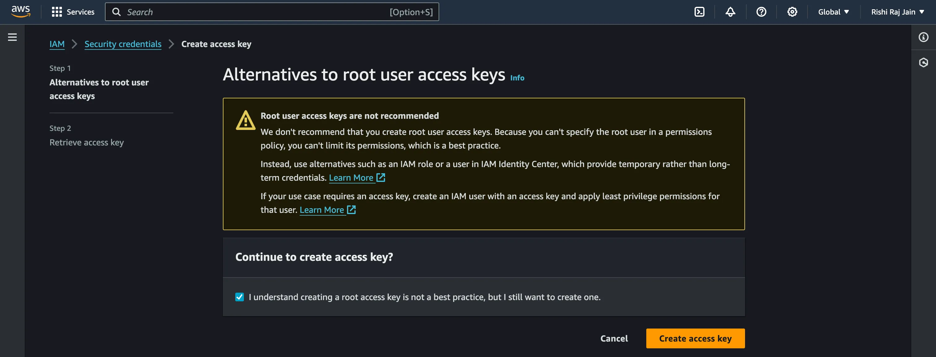 In the navigation bar on the upper right in your AWS account, click on your name, and then choose **Security credentials**.